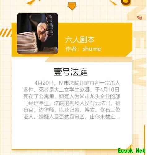 《我是谜》6人剧本壹号法庭简介剧本作者:shume 剧本类型:都市 剧本人数:6 剧本时长:2-3小时 《壹号法庭》简介 4月20日,M市法院开庭审判一宗杀人案件。死者是大二女学生赵娜,于4月10日死在了公寓里,嫌疑人为M市龙头企业的部门经理辜江。法院的到场人员有云法官,检察官,边律师,以及归蜜、博安、佟石三位证人。嫌疑人是否就是真凶,由你来裁定。