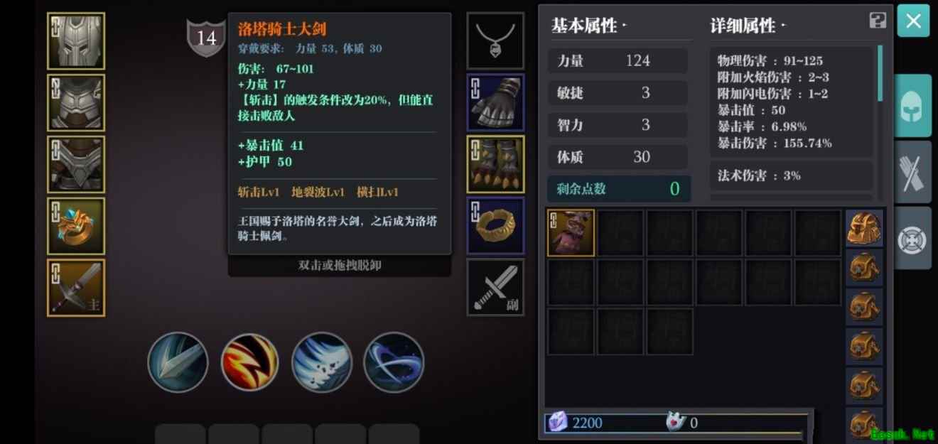 玩战士就得有心理准备,因为攻速慢,所以很容易被小怪A到,但是只要你不死,死的就是它。不用担心战士血降的快,因为血厚而且加体了,所以你吃怪掉的血球、喝血瓶,回血要比枪兵多。 重剑战士有2个比较好用的技能:斩杀(图中的斩击技能,对30%血量以下的怪造成更多伤害)、横斩(就是刷刷砍2剑那个,图中的横扫这个技能)。 斩杀打boss神技,趁boss技能僵直期来一下,伤害非常足;横斩之所以是神技,因为它可以取消平A后摇(具体操作是:平A第一下抬手的时候,马上按横斩,可以连平A的伤害一起打出来。你看到的就是刷刷刷3个伤害),打小怪安逸的很。