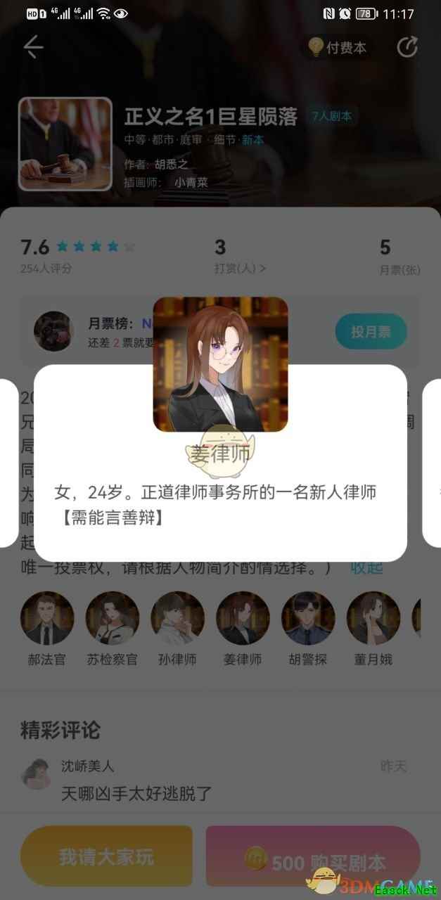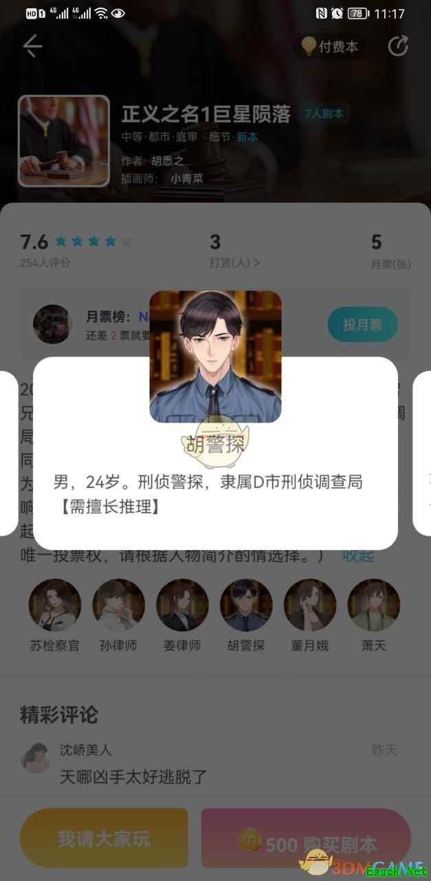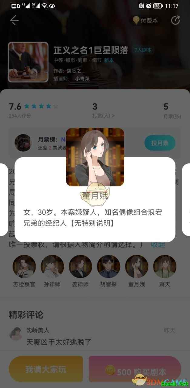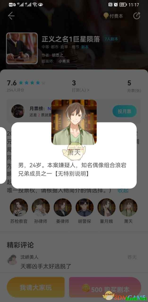 背景故事 2021年4月1日晚22时18分,知名双人偶像组合"浪宕兄弟。的成员之一"胜英"在其公寓阳台坠楼身亡。刑调局根据调查结果,将案发时曾在现场附近待过的死者同组合成员"甭天"以及该组合经纪人"董月娥"一并列为嫌疑人并实施拘留。因该案涉及公众人物且社会影响较大。检察院公诉机关将于近日对该二位嫌疑人提起公诉。(该剧本结构复杂,且法官需要控场并拥有唯一投票权。请根据人物简介酌情选择。) 该剧本看似是一场普普通通的庭审,但实际上,整桩案件却是错综复杂,其中穿插多条故事线,这些故事线多多少少都涉及到一些违法的勾当。而无论是嫌疑人还是证人,都或多或少参与到了这些故事线当中。但是,想要找出真相,单凭剧本里的线索显然是不够的。 毕竟,任何罪犯都不会轻易地将线索留在案发现场供人围观,他们往往会根据实际情况,想方设法销毁自己留下的一切证据。但即便如此,只要有过任何行为,就必定会留下蛛丝马迹。这些蛛丝马迹,便会穿插在整个剧本的各处细节之中。只要能够将这些细节挖掘出来,并串联在一起,便可以理清整个故事的全貌。 在本案中,有目击者证明萧天在死者坠楼时正在案发现场,二人之间也确实一起犯下了一些不法勾当。加之萧天在目睹死者坠楼后,删除了自己和死者之间的部分短信内容,虽然他的目的是为了防止浪宒Bar 的事情暴露,但这种此地无银三百两的行径,却更是增加了他的嫌疑。