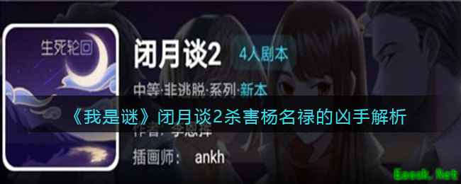 《我是谜》游戏app是一款烧脑的推理类益智游戏,各种类型的剧本应有尽有,其中【闭月谈2】剧本共有三个案件,三个凶手,下面给大家带来的是《我是谜》闭月谈2杀害杨名禄的凶手解析介绍,感兴趣的小伙伴可以关注一下! >>>>小编推荐:《我是谜》剧本答案攻略大全