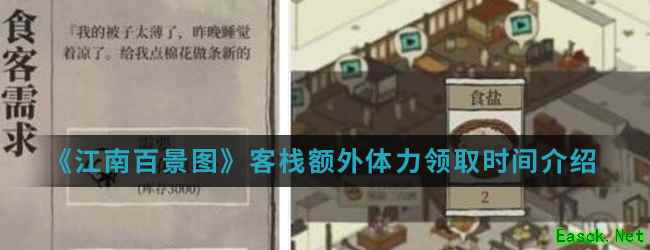 在江南百景图手游中客栈额外体力什么时候领取呢?在客栈中体力用完了可以获取额外体力,但是额外体力是有时间限制的,那么什么时间可以领额外体力呢?想知道的小伙伴就跟随小编一起来看看吧。