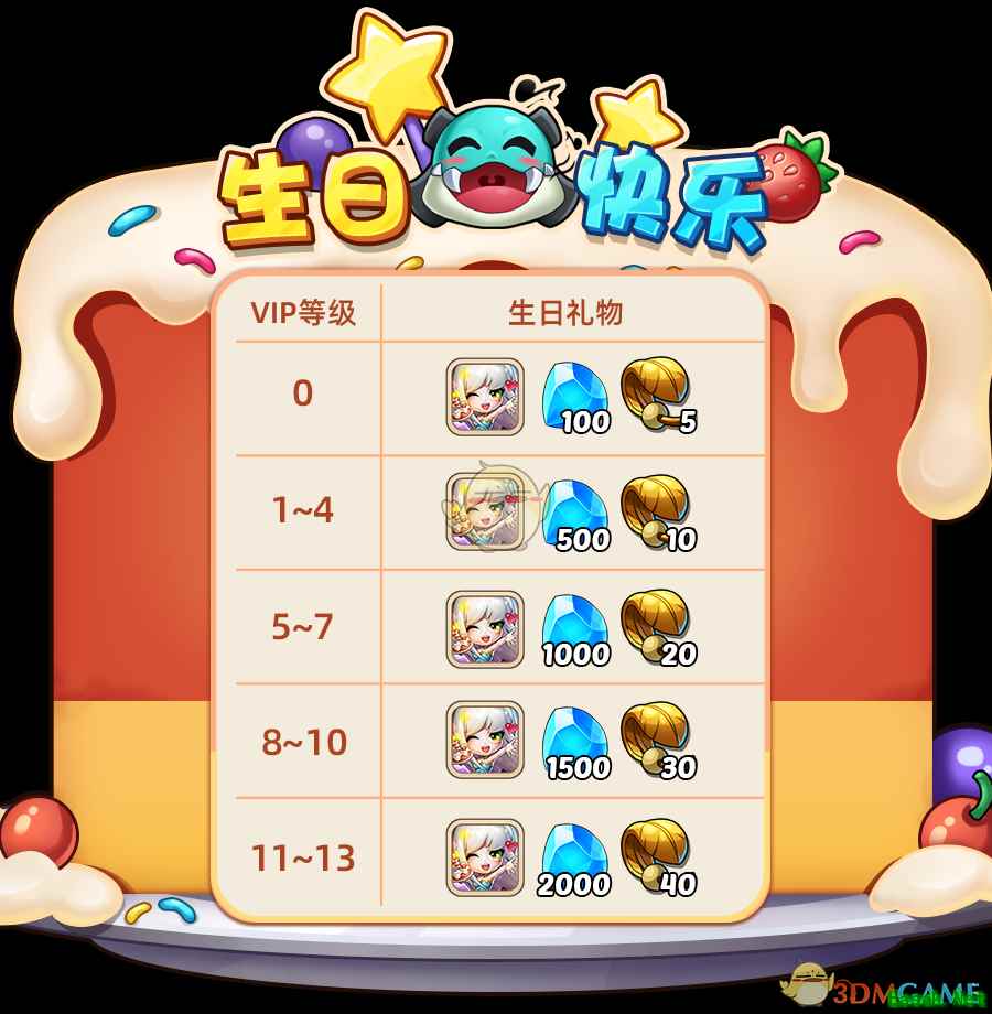 生日礼物免费领取,每次触发限领取一次; 生日礼物以触发生日功能时的VIP等级为准,若生日当天变更VIP则生日礼物不变; 生日祝福持续时间仅限生日当天,若未及时领取,第二天就会直接消失; 若兵粉未在生日当天登陆游戏,那么这一年都不会再触发生日功能。 以上就是小编整理带来的《放置奇兵》生日功能玩法攻略介绍,大家还喜欢吗?更多精彩内容,请点击关注手游网,小编将持续为您更新! 本文内容来源于互联网,如有侵权请联系删除。 |