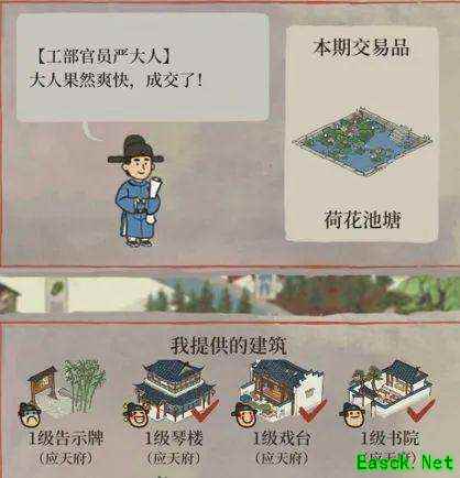 而且严大人一天只会出现一次,每次要呆一个小时,如果遇到交易,卖完就走了。 第二次在出现可能需要隔天才会出现,所以玩家们需要多观察下地基中的人物,就可以遇到严大人了呢。 那么玩家们可以跟严大人换什么更好 一点呢? 玩家们可以拿150的积分换到竹林花园、白哦年银行或者荷花池塘这些园林都是有价值的,具体的就看玩家们交换到什么东西了呢。 以上就是小编整理的关于《江南百景图》严大人出现时间介绍的全部内容。更多游戏攻略请持续关注手游网! |