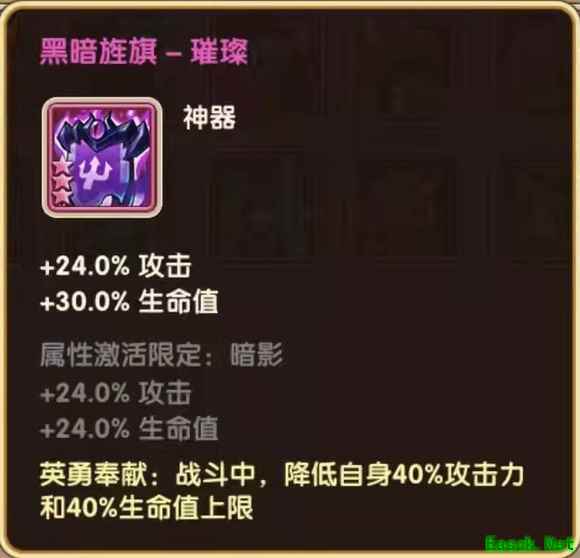 《放置奇兵》黑暗旌旗璀璨介绍黑暗旌旗——璀璨 +24.0%攻击 +30.0%生命值 属性激活限定:暗影 +24.0%攻击 +24.0%生命值 英勇奉献:战斗中,降低自身40%攻击力和40%生命值上限