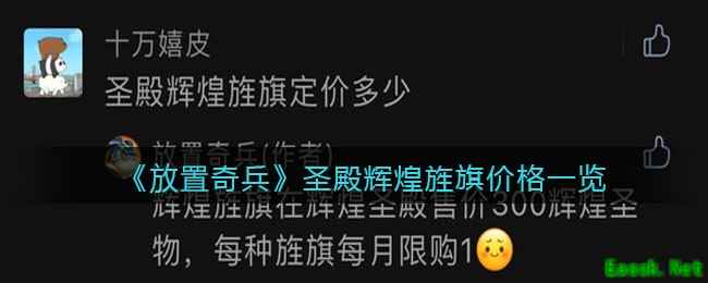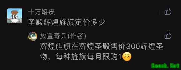 《放置奇兵》圣殿辉煌旌旗价格一览辉煌旌旗在辉煌圣殿售价300辉煌圣物,每种旌旗每月限购1