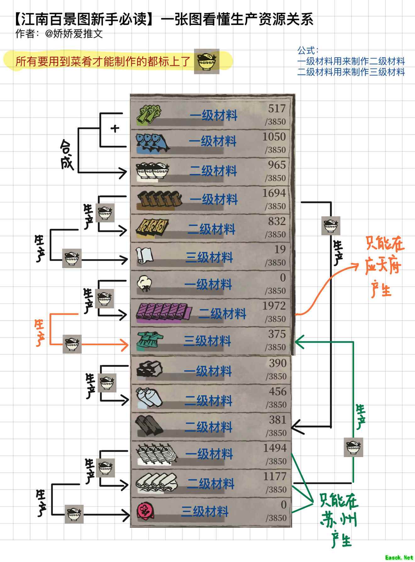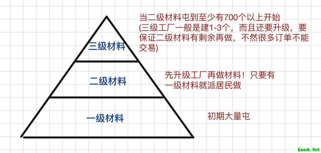 资源生产关系介绍橙色是应天府独有 绿色是苏州独有 根据一级,二级,三级物资的需求关系,我们可画一个金字塔