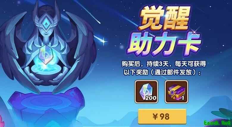 活动期间,提交指定阵营的6星英雄,可获得契约星钻奖励,同时提交的英雄将会被消耗。 图示四个阵营各限定一次; 傀儡不可用于本次活动任务。 活动期间购买觉醒助力卡,持续3天每天获得的奖励如图所示。