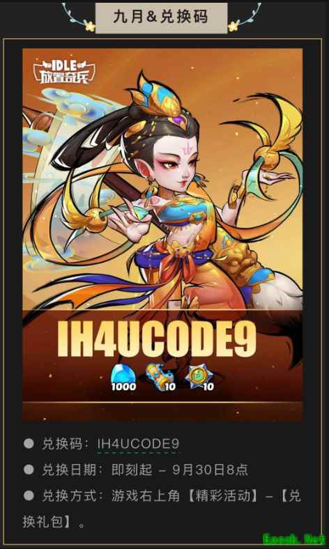 放置奇兵2025年9月兑换码最新可用兑换码:IH4UCODE9 兑换日期:即刻起-9月30日8点 兑换方式:游戏右上角【精彩活动】-【兑换礼包】。