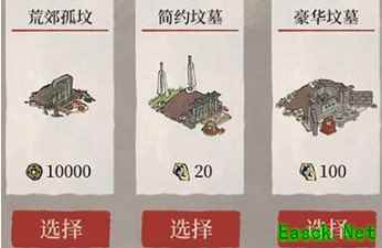二、坟墓选择 这三种坟墓在效果上面是没有什么区别的,只是外观上面会比较好看一些。 所以不是很推荐大家建造豪华坟墓,毕竟补天石有更多其他的用处。 条件好一点的玩家们可以选择简约坟墓,毕竟荒野孤坟的环境实在不是很好。 在居民们死亡之后,会有新的居民再搬进来。 以上就是小编整理的关于《江南百景图》坟墓选择推荐攻略的全部内容。更多游戏攻略请持续关注手游网! |