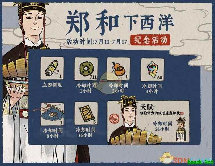 《江南百景图》郑和下西洋纪念活动奖励一览405年7月11日,明朝航海家郑和开启了海上远航活动,完成了古代历史上规模最大的航海探险。 为了纪念他的勇气与智慧,《江南百景图》明日11点会在游戏内开启“郑和下西洋纪念活动”! 活动时间:7月11日11:00至7月17日23:59分 纪念活动方式: 活动开启后初登陆即可领取【金画轴*1】; 距离首次领取1小时后,即可领取【711枚铜钱】; 距离上次领取2小时后,即可领取【三白酒*1个】; 距离上次领取4小时后,即可领取【60个补天石】; 距离上次领取8小时后,即可领取【喜笑严开旗*1个】; 距离上次领取16小时后,即可领取【永久加速票*5张】; 距离上次领取24小时后,即可领取侯级别卡牌【郑和】;