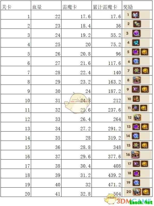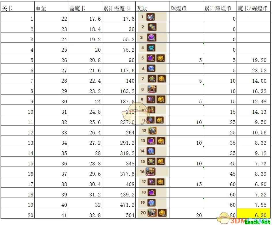 其实上图有用的奖励也就只有辉煌币,其他资源基本都是垃圾。 从魔卡数量/辉煌币来看,性价比最高的是第20关,换言之氪金的话,要么不氪,要么就氪到第20关!