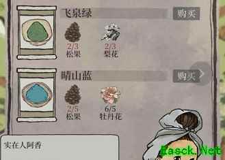 晴山蓝购买位置介绍玩家们在丽娘府邸会遇到这个任务,这次需要晴山蓝颜料比较多,玩家们需要多寻找才能获得晴山蓝颜料哦。 晴山蓝具体位置: 晴山蓝就在买早餐的npc手里,玩家们只要从这里购买就能获得晴山蓝,晴山蓝需要5个松果以及5朵牡丹花才能购买到。 所以玩家们需要先凑齐这个颜料所需的材料才能购买到颜料哦。