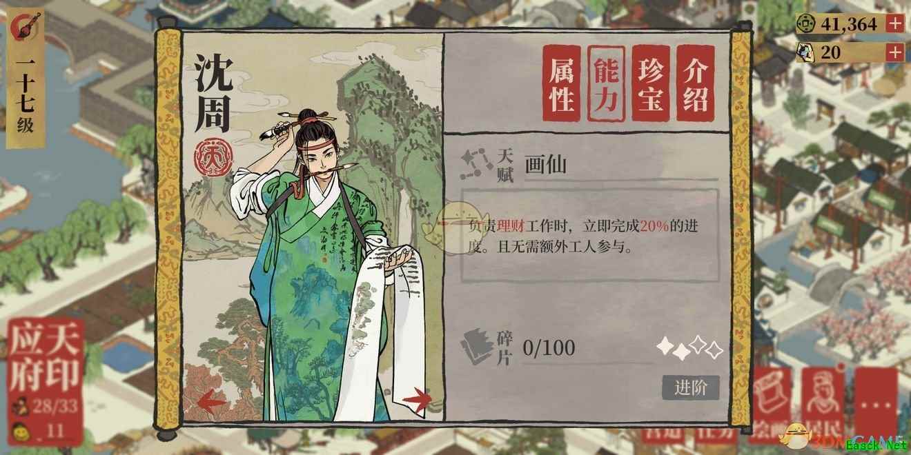 二、大才子唐伯虎 唐伯虎擅长建造和制作,他有一下特点 1、特长 和异性工作可以获取零钱 2、珍宝 推荐镇河铁犀和打神鞭等珍宝 3、玩法 优先升级的角色,可以留守应天修宝塔,也可以去苏州开荒 三、大帅哥沈周 沈周擅长理财和制作 1、特点 沈周擅长理财,并且在高速度的特性下不需要工人 2、珍宝 推荐太极图,配合专属装备龟壳更适合工作 3、玩法 建议常驻苏州,是高营业额产业的必要角色