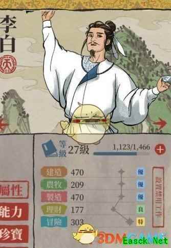 全角色图鉴大全:点击查看 《江南百景图》天级人物排行一、全能王李白 李白是江南百景图中最全能的一个角色(没有之一),他的特点如下 1、擅长工作 最擅长驿站探险,云游的能力配合三百酒最无敌 2、珍宝搭配 珍宝随意搭配,全能王就是这么任性 3、玩法 推荐优先升级,各行各业都能顶上
