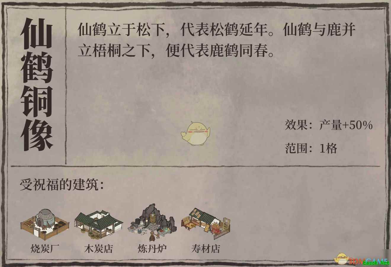 一、仙鹤铜像BUFF解析 目前在游戏中仙鹤铜像的效果是在周边一格范围内增加产量百分之五十,其带来的BUFF可以给烧碳厂、木炭店、炼丹炉和寿材店带来加成。