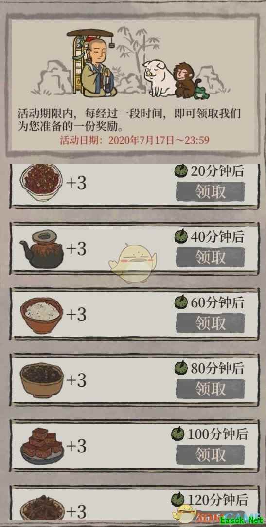 《江南百景图》护肝送香料活动介绍为了缓解大人们会出现一直得不到某种香料的情况,我们会在【州府】-【公告】中增加一个累计时长领取香料的活动! 送香料活动方式 活动开启后初登陆即可领取【1000枚铜钱】; 距离首次领取20分钟后,即可领取【花椒*3】; 距离上次领取40分钟后,即可领取【香油*3】; 距离上次领取60分钟后,即可领取【食盐*3】; 距离上次领取80分钟后,即可领取【胡椒*3】; 距离上次领取100分钟后,即可领取【红糖*3】; 距离上次领取120分钟后,即可领取【八角*3】; 注意事项: 在厨艺大赛活动期间内,每日都会有送香料活动! 当天的香料领取时限截至当天23:59,请知府大人们及时领取!