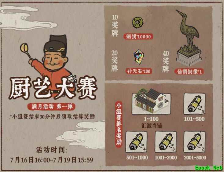 2、厨艺大赛须知 (1)除去个人累积奖牌奖励之外,累积奖牌还会计入排行榜,知府大人们会额外获得排行榜奖励,只要知府大人积极参与活动,就有很大机会获奖哟! (2)为增加各位知府大人的得奖机会,我们会将所有玩家随机分组形成排行榜(并非全服共用同一个排行榜),每组5000人; (3)小组赛结束30分钟后领取结算奖励。 活动时间:2020年7月16日16:00 ~7月19日15:59 (备注4:奖励分两种: ①牌子数量奖励: 收集到10/20/40奖牌可分别得到10000铜币/100补天石/仙鹤铜像。 另外,仙鹤铜像为“烧炭厂/木炭店/炼丹炉/寿材店”进行50%产量加成,范围为1格,可移动雕像。 但是选择放置雕像到城市里一定要慎重,放到应天府的话就不能挪到苏州,放到苏州就不能挪到应天府,仙鹤铜像建议放到应天府。 ②小组排行榜奖励: 每个人的奖牌数量又会进行小组排名。重点:是小组的排名而不是总排名,小组排名前一百可以获得特殊建筑—汇源当铺! (备注5:限时建筑包括汇源当铺都是生产2h即结束生产,只有在你在线,并且税客司收取了或者你手动收取了才会开始下一个2h的生产,并不是24h不间断生产。)