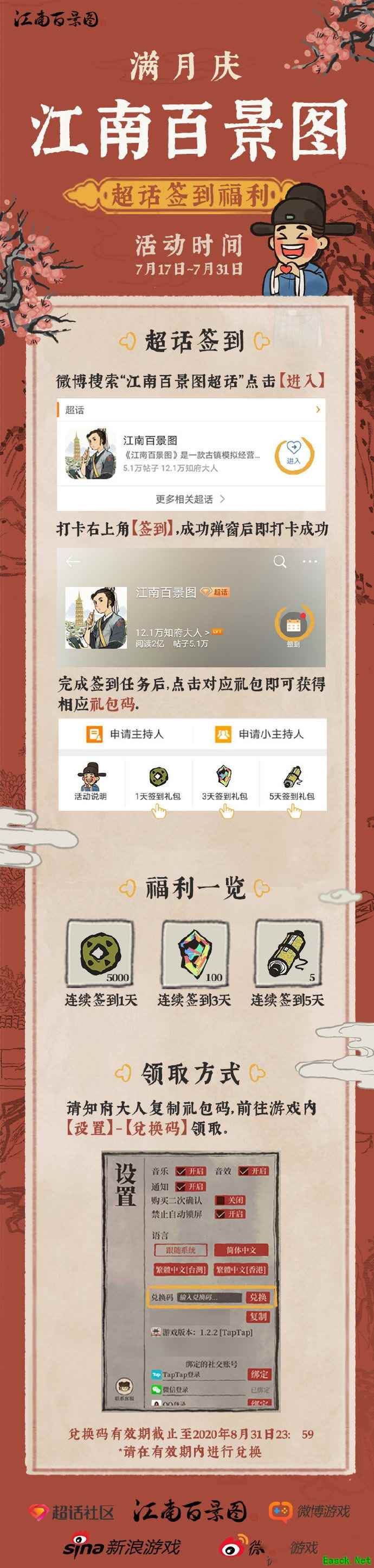 奖励说明礼包说明∶【注意】7月17日活动开启后1/3/5天连续签到后,【需点击上方个领号】,过时将无法领取。 【注意】礼包兑换∶进入游戏-点击右下角"…."-设置-输入兑换码 礼包兑换截止日期∶2020年8月31日23∶59,请在有效期兑换哦。 【注意】如提示操作异常或运气不好,请多次点击领卡,或稍后尝试领取。 【注意】领卡相关问题可私信@新浪游戏活动 礼包内容∶连续打卡1天∶5000铜钱 连续打卡3天∶100补天石 连续打卡5天∶5金画轴 以上就是小编整理的微博活动免费领取金画轴的方式,如果想了解更多关于游戏相关资讯,请点击关注手游网。 |