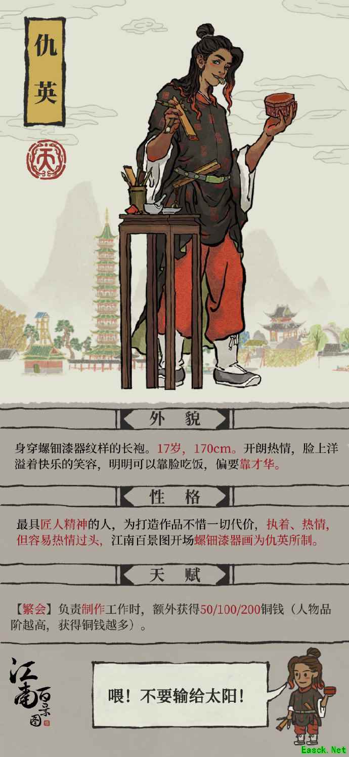 仇十洲雕琢刻镂,英人杰不问出身——仇英 仇英,中国明代绘画大师,以擅画美人著称,与唐寅、文徵明、沈周并称吴门四家(明四家)。仇英出身寒门,曾是一名漆工。与其他三位不同,仇英甚少为自己的作品配诗句题跋,只题名款。 在江南百景图中,仇英是一位开朗、热情的阳光少年,为打造优秀的作品可以不惜一切。雕刻工人出身的他,在机缘巧合下结交了文徵明、沈周、唐寅,同时因为作品极具灵性,被文徵明与唐寅力荐给吴郡的名贤高士:周臣。 以上就是小编为大家带来的江南百景图江南百景图仇英属性技能了,如果想了解更多关于游戏相关资讯,请点击关注手游网。  |