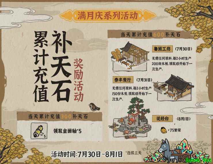 累计充值活动活动时间:7月30日0:00至8月1日23:59 活动期间,当天累计充值满300补天石,即可获得【金画轴*5】(每天一次),每日0点更新; 此外7月30日当天累计充值满600补天石(仅限当日),即可获得【鲁班工坊*1】; 7月31日当天累计充值满600补天石(仅限当日),即可获得【泰丰炭行*1】; 8月1日当天累计充值满600补天石(仅限当日),即可获得【说经台*1】。 【提示】计入累充活动的补天石有:直接购买补天石(不包含首充双倍及额外赠送),礼包中的补天石,月卡首次获得的300补天石。