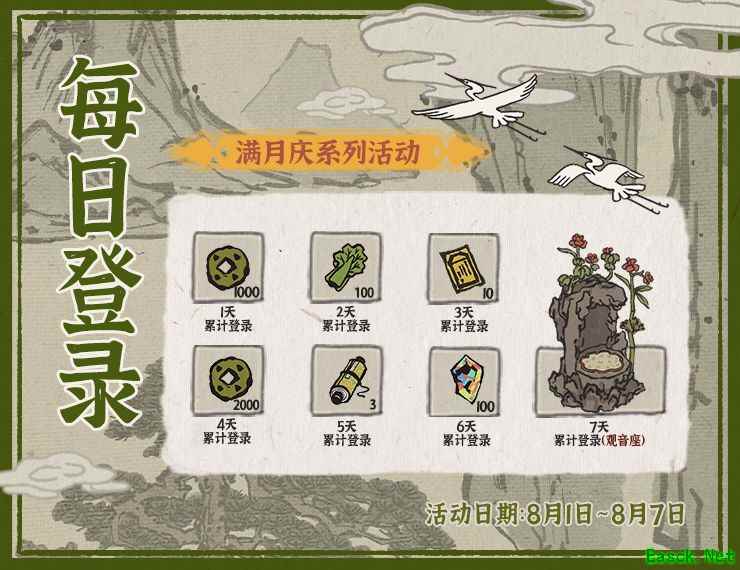 满月在线登录奖励活动时间:8月1日0:00至8月7日23:59 每日登录即可领取铜钱、永久加速票、金画轴、全新建筑【观音坐】等好礼~