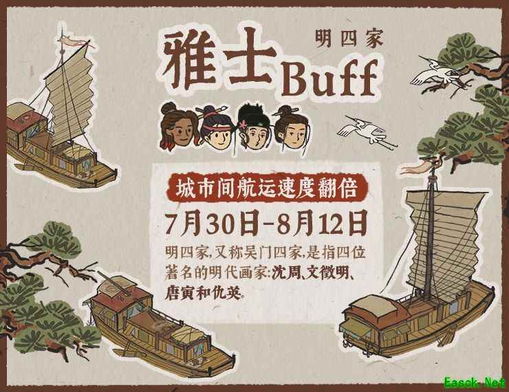 明四家雅士BUFF 活动时间:7月30日0:00至8月12日23:59 明四家,又称吴门四家,是指四位著名的明代画家:沈周、文徵明、唐寅及仇英。对于需要经常外出写生的明四家们,船只是必不可少的交通工具~ 明四家集结,城市间船只航运速度翻倍~助力知府大人们加速城建!