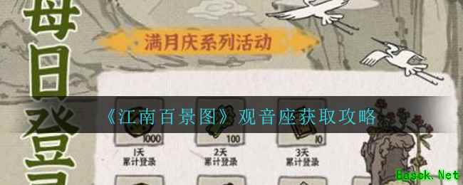 江南百景图观音座获取方式:玩家们参与到江南百景图的满月庆系列活动,每日登陆即可获得活动中的登陆奖励,而连续登陆七天就可以获得观音座。 活动时间:8月1日-8月7日。 由于活动只有7天,也就是说玩家们需要连续登陆才能拿到最终的观音座奖励,总的来说获取难度不是很高。 观音座没有什么特殊的属性加成,但是能够增加城镇中的环境值,属于装饰类型的建筑。