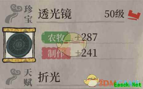 江南百景图透光镜效果搭配解析1.透光镜能够为角色带来10%的农牧属性加成。 2.透光镜有着天赋技能“折光”,在草药田工作的时候,草药的产量增加100%。 3.透光镜最适合搭配的角色是李时珍,李时珍有着非常高的农牧属性,透光镜10%的加成在李时珍身上能够变成大幅度的属性加成。并且李时珍有着天赋技能“百草”,只要是负责农牧工作,就能够额外获得100%的产品,搭配透光镜的天赋技能,一次能够额外获得200%的草药产量。