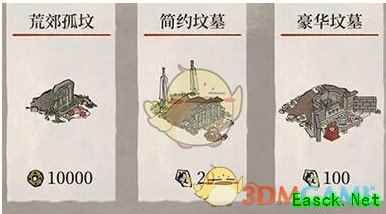 二、坟墓种类 1、荒野孤坟 价格:10000铜币。 2、简约坟墓 价格:20补天石。 3、豪华坟墓 价格:100补天石。