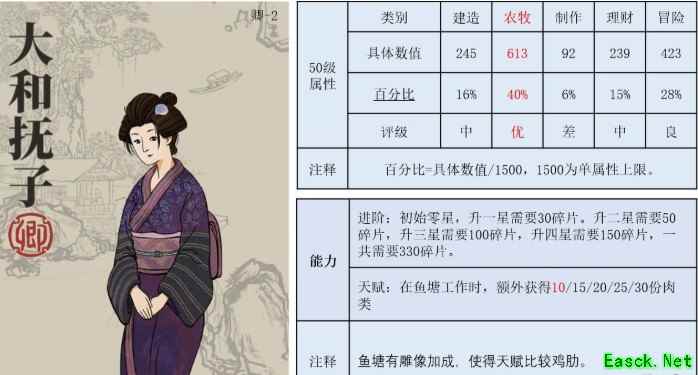 大和抚子使用方法介绍: 侯卿中优级以上农牧的角色不多,朱元璋/徐光启/杜甫/大和抚子均建议培养。 大和抚子主要用来搞农牧。 珍宝推荐哮天犬(可用鸡缸杯/澄泥砚代替)。 搭配哮天犬,农牧属性928,农牧加成61%,冒险体力330。 搭配鸡缸杯,农牧属性873,农牧加成58%,制作加成15%。 搭配澄泥砚,农牧属性812,农牧加成54%,理财加成32%。