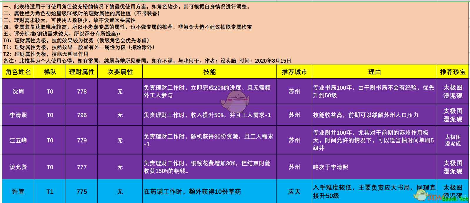 《江南百景图》理财角色排行一、注意事项 1、此表格适用于可使用角色较充裕的情况下的最优使用方案,如角色较少,则可根据自身情况进行调整。 2、属性栏为角色初始星级50级时的理财属性的属性值(不带装备) 3、理财需求较大,可使用人数较少,故不设置次要属性 4、专属装备获取难度较高,所以不考虑专属的属性,也不做专属的推荐,非氪金大佬不建议抽取专属珍宝 二、评分标准(铜钱需求较大,所以评分有所提高) T0:理财属性为极,技能效果较为优秀(侯级角色会优先考虑) T1:理财属性为极,技能效果-般或有另一属性为极(探险除外) T2:理财属性为极,技能无明显作用