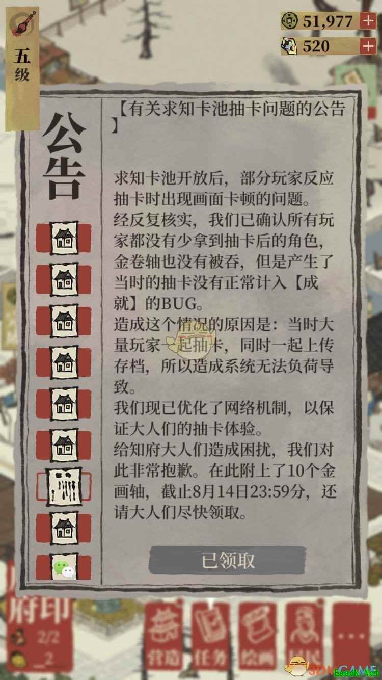 抽卡卡顿解决方法介绍: 一、卡顿原因 求知卡池开放,大量玩家一起抽卡,大批存档同时上传,造成系统无法负荷,产生了抽卡成就没有正常计算的BUG,出现抽卡是画面卡顿的问题。 二、解决方法 江南百景图官方现已对游戏进行了网络机制优化,玩家可以放心在卡池抽卡了。 三、补偿内容 运营团队在州府—查看公告处附上了10个金画轴,截止8月14日23:59分,还请大人们尽快领取。