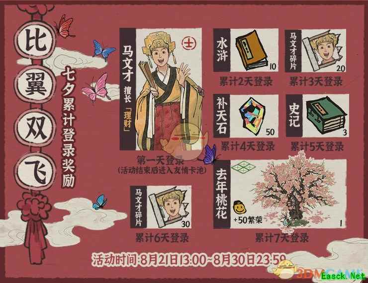 活动时间:8月21日13:00—8月23日23:59 各位大人们,处暑时节福利来咯! 桃花村门票免费领!还有书籍、金画轴福利等你领取~ 探秘桃花村活动将于8月末开启,敬请期待吧。 二、【比翼双飞签到活动】