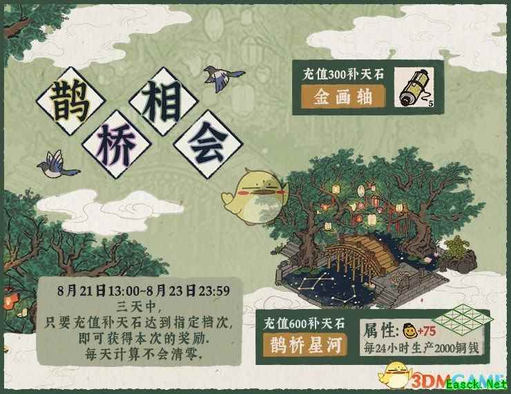 活动时间:8月21日13:00—8月23日23:59 活动期间内,累计300补天石,即可领取【金画轴*5】; 活动期间内,累计600补天石,即可领取【鹊桥星河*1】(占地面积3*3)。 计入累充活动的补天石有:直接购买补天石(不包含首充双倍及额外赠送),礼包中的补天石,月卡首次获得的300补天石。 以上就是本期关于《江南百景图》七夕恋江南活动内容一览2020的全部内容了,要想获取更多游戏资讯请点击关注手游网。 |