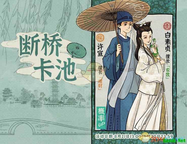 卡池UP时间:8月21日13:00—8月30日23:59 天级角色【白素贞】& 侯级角色【许宣】共同进入【断桥】卡池。 该卡池活动期间【白素贞】、【许宣】将概率UP。 五、【七夕珍宝卡池开启】