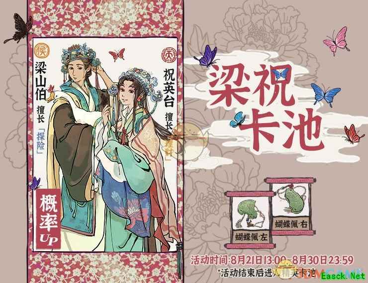 卡池UP时间:8月21日13:00—8月30日23:59 天级新角色【祝英台】&侯级新角色【梁山伯】、新珍宝【蝴蝶佩·左】&【蝴蝶佩·右】共同进入【梁祝】卡池。活动期间新角色将概率UP,且可以抽到新角色的专属珍宝,活动结束后新角色将进入【精英】卡池。 四、【断桥】卡池UP