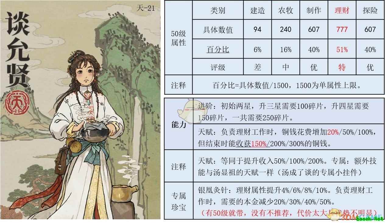 《江南百景图》谈允贤培养建议一、工作建议 谈允贤,理财能手,无论是挂机刷钱,还是客申刷书局(与许宣相当),都比李清照差了那么一点点。顺带探险(不冲突,冒险体力303,无须额外佩戴探险类珍宝),制作也尚可。 谈允贤用来客串刷书局,珍宝推荐太极图,书局减少时间是当参与工作的居民进入书局后立即生效,提示减少时间后可将太极图卸下给其他人物佩戴。 二、珍宝搭配 搭配太极图 理财属性1154,理财加成76% (也即书局减少时间高达76%,可做到四级书局58min刷一轮),农牧加成28%。 搭配银凰灸针 理财属性1101,理财加成73% (也即书局减少时间高达73%,可做到四级书局65min刷一轮),制作加成56%。 谈允贤用来搞理财(除书局),珍宝推荐太极图(可用澄泥砚/青铜爵代替,推荐用青铜爵) 搭配澄泥砚,理财属性1040,理财加成69%,农牧加成28%。 搭配青铜爵,理财属性913,理财加成60%,制作加成59%。( 制作属性也很好)