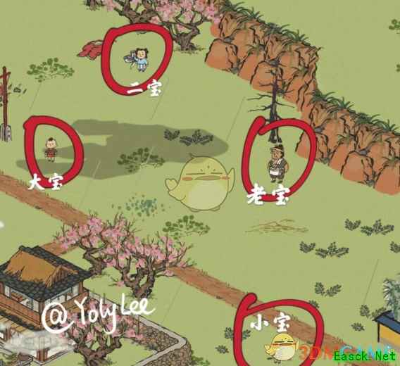 8、二宝/风筝 二宝位置如图所示,风筝花费兔子毛×5、体力×35; 9、小宝/面具 小宝位置如图所示,面具花费野兽骨头×5、体力×35; 10、老宝/鱼汤 老宝位置如图所示,鱼汤花费青鱼×3、鲤鱼×2、体力×35。 11、凤仙花铲子