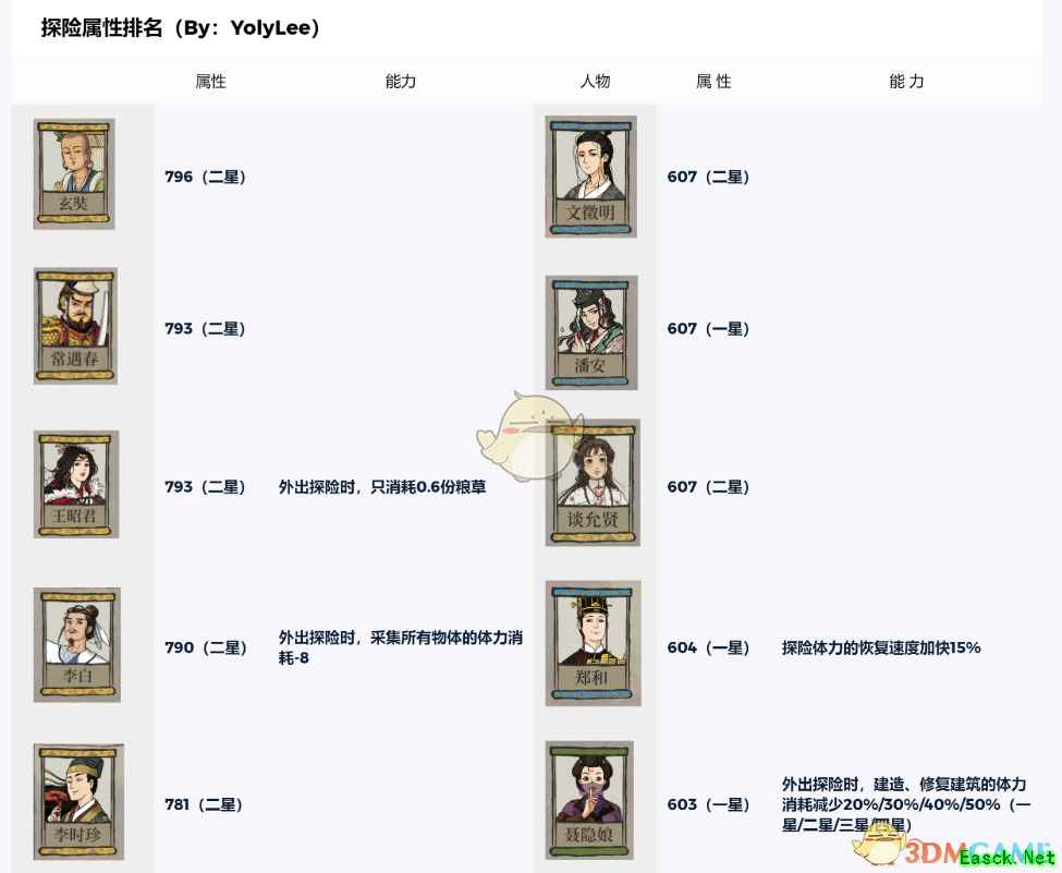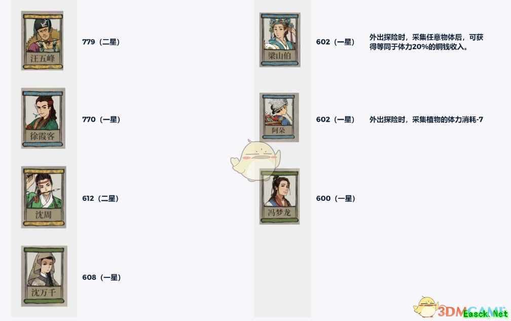1、筛选的探险属性在600以上,其余基本在400左右及以下就不在图中了。 2、探险体力值分为佩戴与不佩戴珍宝两种情况,玩家可以根据自身情况调整。 以上就是本期关于《江南百景图》探秘桃花村人物推荐的全部内容了,要想获取更多游戏资讯请点击关注手游网。 |