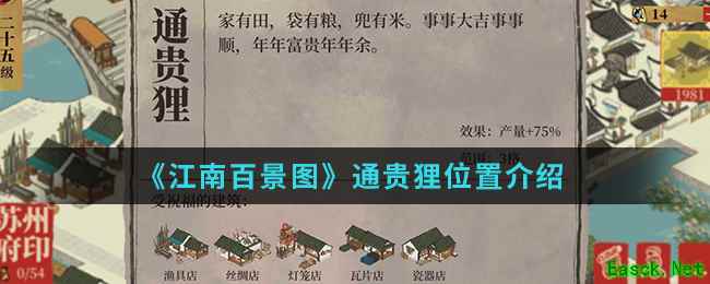 在江南百景图手游中通贵狸在哪呢?通贵狸是苏州的特有建筑,能给特定的建筑产量加成,很多小伙伴都想获得这个特别的建筑,那么想知道通贵狸位置的就跟随小编一起来看看吧。