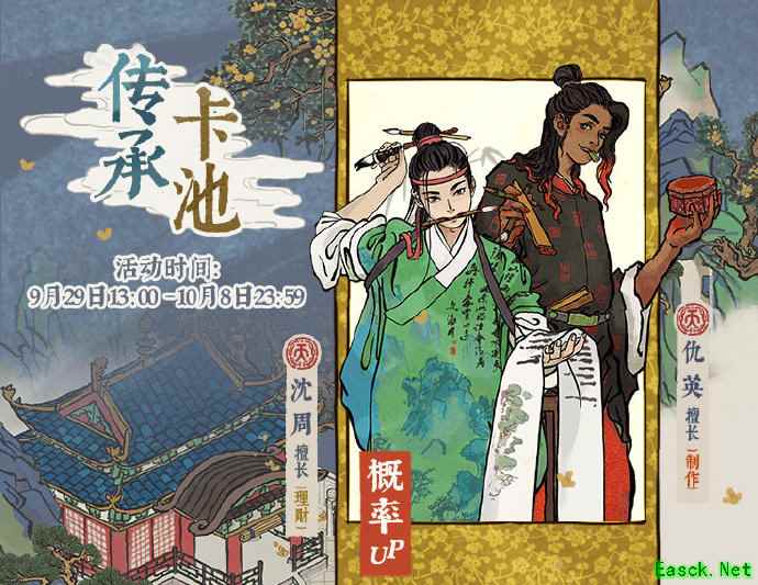 三、【传承】卡池UP 卡池UP时间:9月29日13:00—10月8日23:59 天级角色【沈周】&天级角色【仇英】共同进入【传承】卡池。 活动期间【沈周】、【仇英】概率UP。