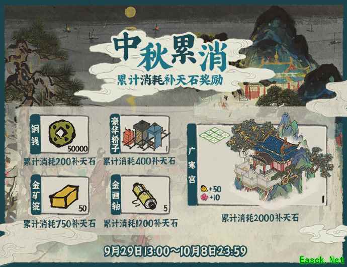 四、中秋累消活动 活动时间:9月29日13:00—10月8日23:59 活动期间内,累计消耗200补天石,即可领取【铜钱*50000】; 累计消耗400补天石,即可领取【豪华轿子*1】; 累计消耗750补天石,即可领取【金矿锭*50】; 累计消耗1200补天石,即可领取【金画轴*5】; 累计消耗2000补天石,即可领取【广寒宫*1】。
