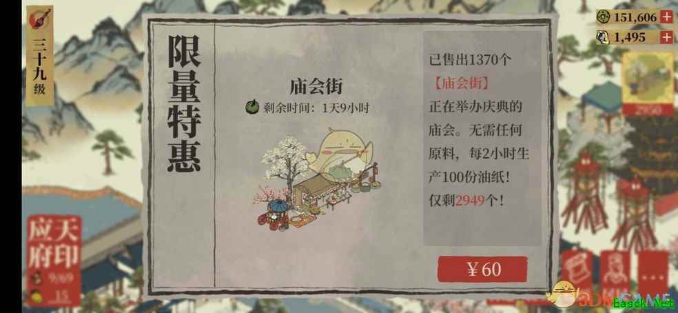 二、作用介绍 1、产出油纸 玩家等级达到34级,即可解锁油纸厂,使用庙会街无需原料即可产出油纸,每2小时产出100份; 油纸可以用来制作花窗店、油纸伞等物品; 2、增加美观性 庙会街还是一个颜值很高的建筑,摊子搭配桃花梨花树,占地面积很大,非常具有烟火气息。 三、获得方法 1、庙会街是一件限时购买的建筑,玩家只能够在特定的时间内使用现金购买获得。 2、当在限量特惠活动中刷新到了庙会街就可以使用60元现金进行购买。 3、庙会街能够无需任何原料,每2个小时自动生产100份油纸。