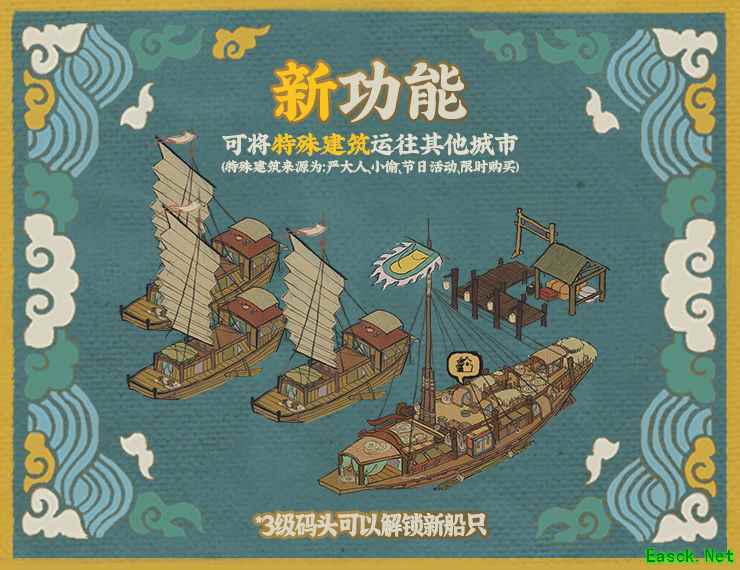 建筑运输作用介绍: 3级码头可将特殊建筑运往其他城市。特殊建筑来源包括:严大人、小偷、节日活动、限时购买。
