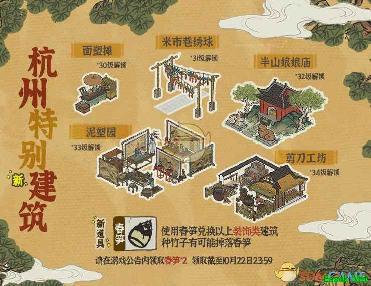 面塑摊、米市巷绣球、半山娘娘庙、泥塑园、剪刀工坊。可使用「春笋」兑换。种植竹子有概率掉落「春笋」~ 增加新成就: 「西湖天堂」、「十里湖光」。 增设其他西湖美景: 苏堤春晓、湖心亭。 【再续前缘,苏州府探险更新!】 开放苏州府驿站剧情第一章「阊门」。
