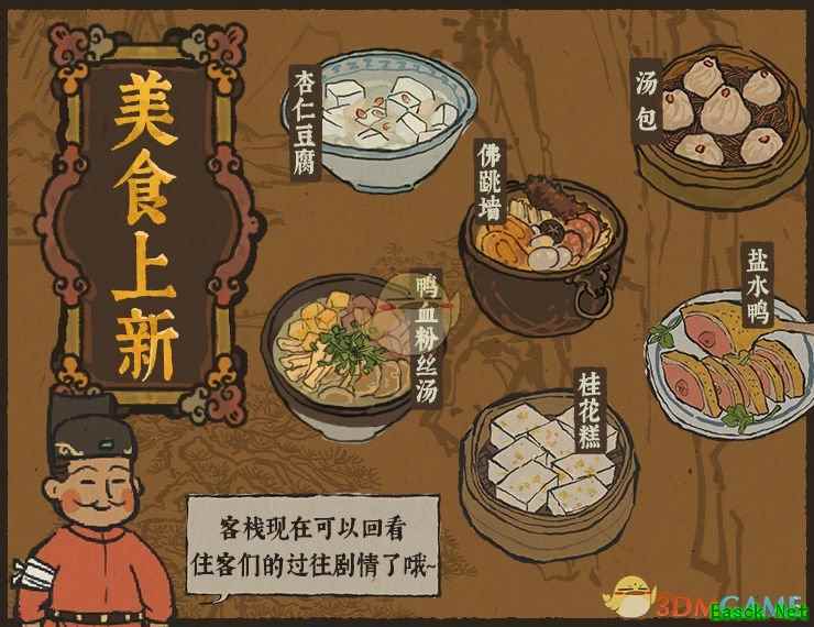 美食新伙伴~桂花糕、汤包、鸭血粉丝汤、杏仁豆腐、盐水鸭、佛跳墙。 增加建筑运输:
