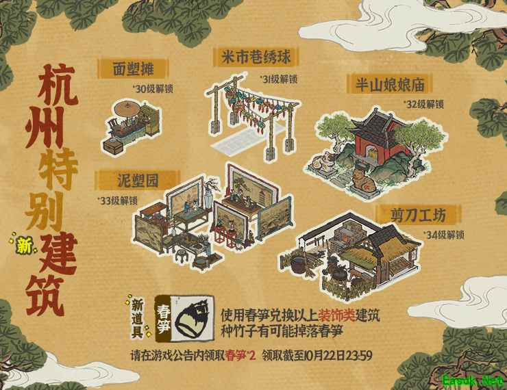 大人们解锁苏州府驿站剧情,同时游戏等级需满足≥27级,即可进入杭州府。 新增杭州特产: 竹子、茶叶、折扇、团扇。 新增五处杭州府奇观: 断桥残雪、曲院风荷、柳浪闻莺、雷峰夕照、望湖亭(平湖秋月)。