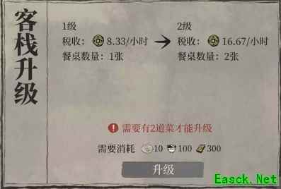 客栈不能升级解决办法介绍: 一、无法升级原因 其实很多玩家是因为出现了bug,就是我们在解锁客栈之后,我们需要先对客栈旁边的路先建造好,如果不建造的话下次要进行升级就很容易出现bug无法升级。 客栈有等级之分,每个阶段的等级收益也差别很大,在条件允许的情况下我们需要尽快升级来提高收益。 1、要先做美食,美食达到一定数量才能升级客栈,点右下角的美食,用好评空碟解锁新美食; 2、如果不是上述原因,那就是客栈等级升满了,客栈等级有上线,满级也是无法升级的。