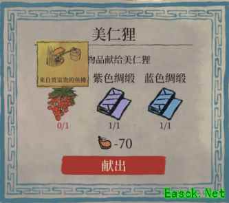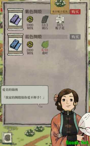 紫色绸缎: 来自锦绣的绸缎铺,铜钱*1000,砚石*3,栀子花*5;