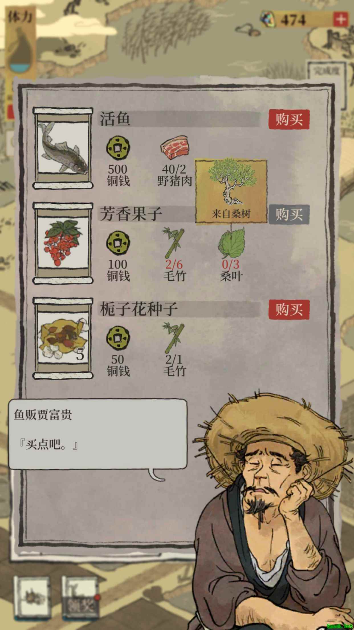 二、材料获取 芳香果子: 来自贾富贵的鱼摊,铜钱*100,毛竹*6,桑叶*3
